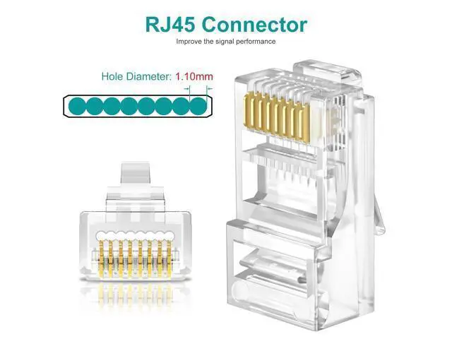 • Specifications: RJ45 8P/8C connector supports 24-26 AWG solid or stranded cable; The hole diameter of the connectors is 1.1mm; Works effectively with any type of pass through crimping tool