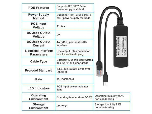 new model: With RJ45 port and DC port with TYPEC. It is an economical and practical PoE remote power equipment base on IEEE 802.3 af /at standard. It can separate the power and data via cable transmission. Proper matching use with poe switch or PSE injector which meet standard IEEE 802.3 af/at, Provides power and data at the same time for the terminal device does not support PoE. PoE splitter, output voltage of 5V use with the power supply equipment, It helps to expand wireless city, Security monitoring and other poe practical place, and is not restricted by layout of power line Features Support international standard IEEE 802.3 af/at (30W) POE port Support 10/100/1000M data transmission PD support 44V-57V voltage transmission, Automatically detects power supply from PSE power supply module 5V/4A power output using TYPEC, the TYPEC port only for power-charging Support the isolation circuit protection, can effectively protect electrical equipment Support the short circuit, overvoltage protection 1500V high voltage isolation Technical Parameters Model TYPEC0504G Transfer Rate 10/100/1000M Power Input 52V DC / 0.6A, Output 5V/4A Standard IEEE 802.3 af/at (30W) TRNF 1/2(+), 3/6(-); 4/5(+), 7/8(-) Interface Type1 Input RJ45 port, 1 output RJ45 port, 1 DC outputTYPEC StandardIEEE 802.3 I, IEEE 802.3 u, IEEE 802.3 x, IEEE 802.3 af/at LEDYellow 5V lampGreen Class 4 lamp EnvironmentWork within -40~70°, Storage within -40~85° Work within 10%~90% Non-condensing, Storage within 5%~95% Non-condensing Dimension 80.3L * 28.3W * 23.2H Weight 0.05 kg Product information Brand Ransanx Hardware Interface USB Type C Color 1PCS 5V 4A Compatible Devices for Raspberry Pi 5, for Raspberry Pi 4, Power Supply Exchanger, IP Camera, Tablets, Dropcam etc Data Link Protocol IEEE 802.3 af/at Data Transfer Rate 1000 Megabits Per Second Manufacturer Ransanx Package Dimensions 6.89 x 4.72 x 0.79 inches Item Weight 1.87 ounces Date First Available May 9, 2025