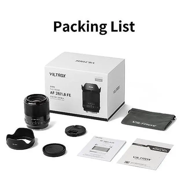 Descripción del producto VILTROX AF 28mm f 1.8 FE Full Frame Wide Angle Lens for Sony E Mount Cameras With large F 1.8 aperture 28mm wide angle fixed focal length, VILTROX 28mm is a great lens for portrait, landscape, indoor, night escape, architecture, It meets the different needs of photographers and video users, and is easy to carry and handle. Specification Focal Length 28mm Maximum Aperture f/ 1.8 Minimum Aperture f/16 Lens Mount Sony E mount Lens Format Full Frame Minimum Focus Distance 37cm Focus Type AF/MF Filter Size 55mm (Front) Dimensions (ø x L) 70mm x 88.2 mm Weight 367g Focus System Internal Focus View angle 74.6 ° Soft background bokeh High-speed Snapshot Auto focus Close-up shooting Full Frame Automatic eye detection Accurate eye detection, focus on human eyes and track moving subjects in real time STM Motor Built-in STM-lead spindle stepper motor, stable and smooth autofocus, best for video recording and high speed snapshot Nano multilayer coating 11 elements in 9 groups Suppress the ghosts and glare of the backlight, Electronic contact Support EXIF Information Transfer Automatic adjustment of the electronic aperture Firmware Upgrade You can update the firmware version of this lens via the USB port to accommodate more new camera models Package included 1 x Lens 1 x Portable bag 1 x Lens Hood 1 x Lens Cap 1 x User Manual