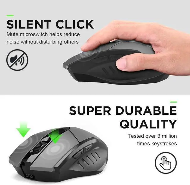 Features: RECHARGEABLE DESIGN Our rechargeable Bluetooth mouse has a built-in high-capacity 500mah battery and charged via a USB cable, providing long-term and abundant battery life SMART POWER SAVING The laptop mouse automatically goes into sleep mode after 5 minutes of inactivity to conserve power and can be activated again by gently moving it. 1000/1200/1600 DPI ADJUSTABLE Support stable connection and precise track with working distance of up to 10 meters. 3 DPI switches (1000, 1200, 1600) change the speed of the mouse freely. 3 MILLION DURABLE CLICKS Real 5 million times keystroke Test and perform well. It's ideal for work or entertainment in home and office. LOW-NOISE CLICKS Advanced sensors provides low-noise clicks, whether you are studying in library or working late at night, it creates a quiet environment without worrying about disturbing others. PLUG IT AND FORGET IT Even if your device does not support Bluetooth connection, our three-mode mouse will provide a USB receiver, plug and play, no additional drivers required