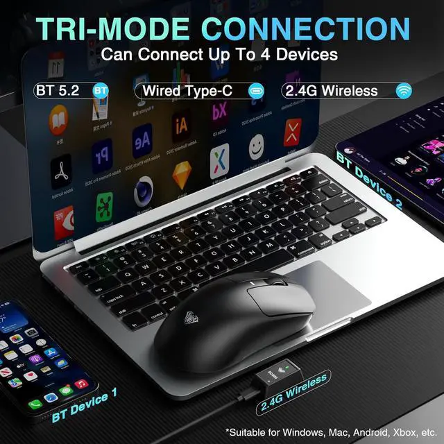 Tri-Mode Wireless Mouse: This gaming mouse supports connecting USB-C, 2.4GHz wireless, and 2*BT5.2 devices, Seamlessly switch between devices such as PCs, laptops, and tablets, allowing you to use it flexibly in various scenarios. It is also compatible with multiple systems such as Windows 7/8/10, Vista, XP, Mac, Windows 2000, and Linux