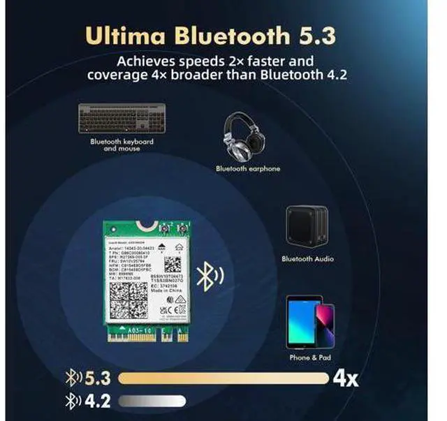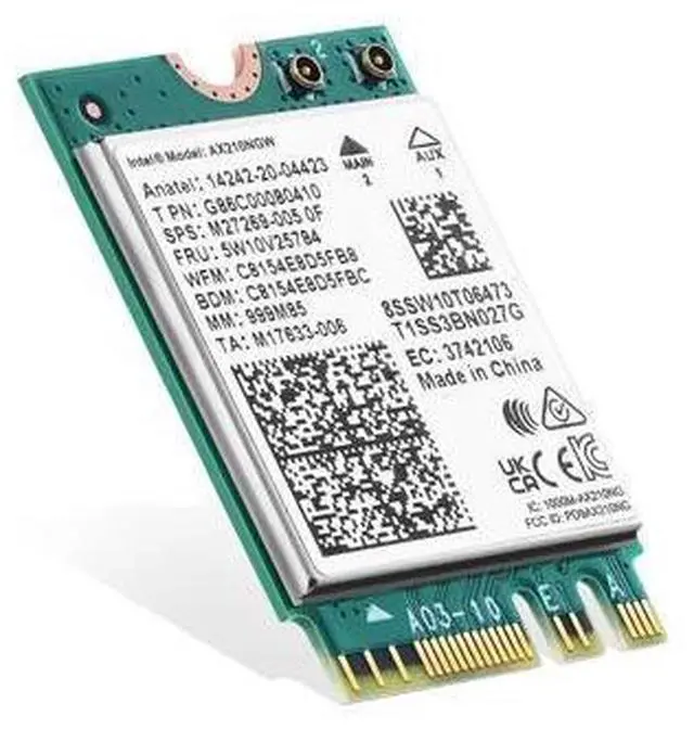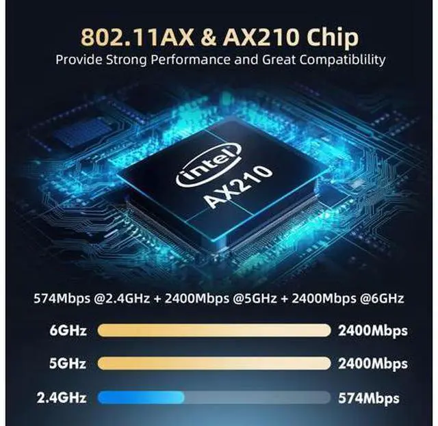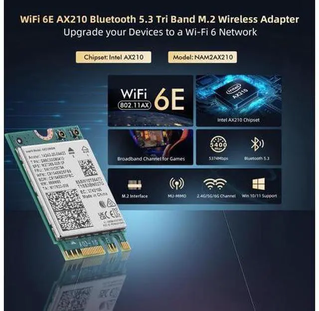 WiFi 6E 5400MbpsThis WiFi Card 6E is equipped with the Intel AX210 chipset, providing ultrafast WiFi 6 and WiFi 6E support, compatible with WiFi5/WiFi4. With speeds up to 5400 Mbps (574Mbps @2.4GHz + 2400Mbps @5GHz +2400Mbps @6GHz), support seamless streaming, high-speed file transfers, without any dropped connections.