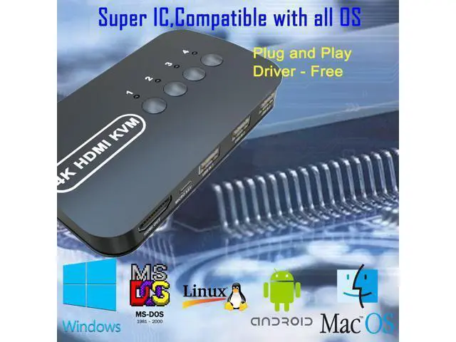 HDMI KVM Switch - 4 Computers share 1 keyboard video mouse. any desktop pc with hdmi output like laptop, gaming computer, office pc, network server computer, mini pc can share same keybord monitor mouse, cut costs and keep desktop room clean. USB Switch - Share 4 USB 2.0 devices, support usb wireless keyboard mouse, printer, scanner, U disk, portable SSD drive, flash drive. plug & play, drive-free, compatible all os, windows, dos, mac os, android, kinds of linux.