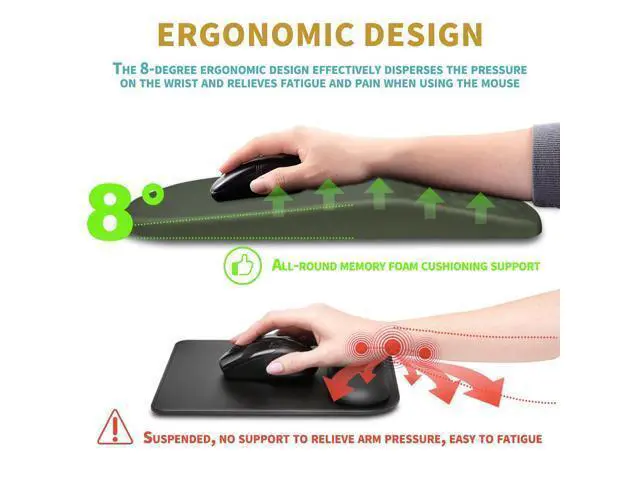 Ergonomic Massage DesignThe innovative ergonomic 8-degree slope and massage bump design perfectly support the wrist and palm. Massage bump design can effectively relieve wrist pain and fatigue, improve carpal tunnel syndrome (CTS), strengthen the air circulation between wrist and mouse pad, prevent sweating, and keep your wrist in the most comfortable state.