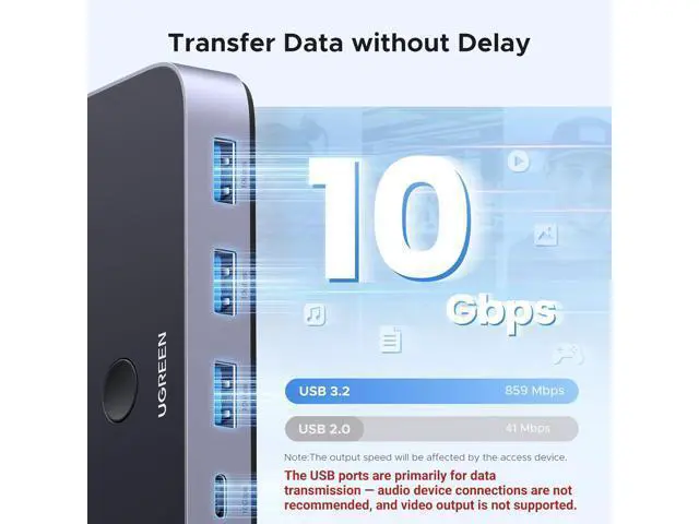Transfer Speed: The USB-C switch is equipped with 4 USB 3.2 Gen 2 ports and speeds up to 10Gbps. Faster than traditional 5gbps USB Switches, Transfer 1 GB files in 1.5 second to improve work efficiency without waiting. (The USB ports are primarily for data transmission audio device connections are not recommended)