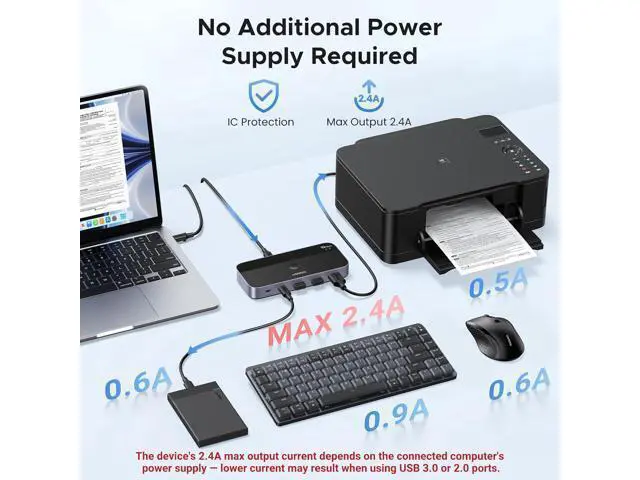 Performance Upgrade: Simple Plug and play and enough to drive most devices without additional power. The MAX power output is 2.4A, support switch work with keyboard, mouse, printer and hard driver without power supply. (Max output current depends on the connected computer's power supply lower current may result when using USB 3.0 or 2.0 ports. )