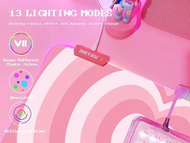 13 Lighting Modes Gaming Mouse Pad Super Glow Fiber provides a great RGB back lit effect. You can choose from 13 lighting modes: 9 static light modes and 4 dynamic mode. Large Size Gaming Mouse Pad at 31.5 x12 x 0.2 inch The gaming mouse pad will fit your mouse perfectly and provide enough mouse movement space, suitable for all types of mice. Easy to use, Plug & Play Gaming Mouse Pad This extended mouse pad is powered by USB, plug and play, no driver required. The control button of this mouse pad has been tested for 10 million times and is extremely durable. Just press it to choose the lighting mode you want. Press and hold about 3 seconds turn ON/OFF. And it has power off memory function remembers your last mode selection. Non-slip & Waterproof Gaming Mouse Pad The durable, non-slip rubber base is designed to eliminate unwanted movement and provide a solid platform for eSports gaming. Waterproof coating surface effectively prevent accidental damage from spilled liquid. ULTRA SOFT & SMOOTH SURFACEDesign with superfine fiber braided material, and allows more accurate mouse movement. Very comfortable when the wrist touches the surface, Best idea for game or work.