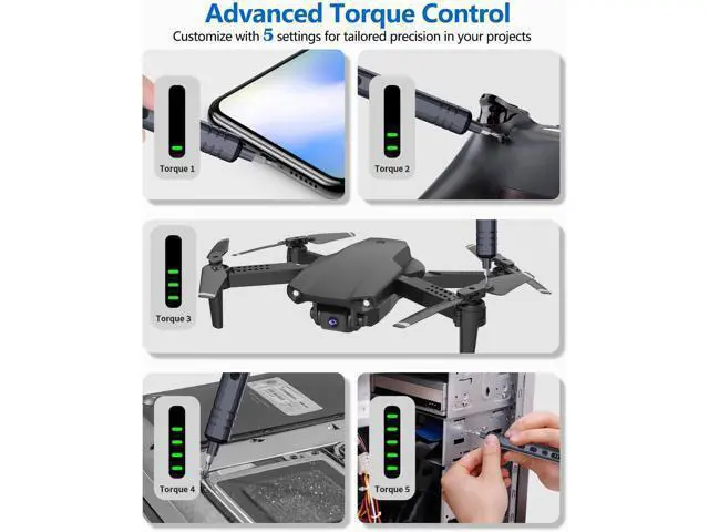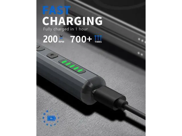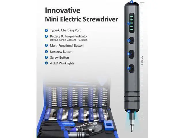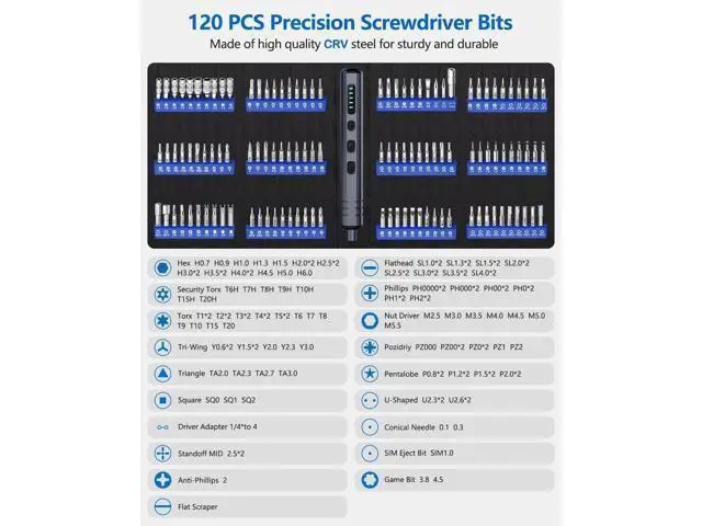 It includes: 1 x small electric screwdriver for quick and effortless screwdriving; 1 x manual precision screwdriver for projects requiring more torque; 120 x precision bits to handle most electronic repairs; 19 repair tools for various disassembly and maintenance tasks. Wide Application - Equipped 120 CRV bits Phillips Torx Flat Head Triwing Hex Pentalobe Triangle etc. This electric screwdriver kit can satisfy all your demands includes PC Computer Laptop Cell Phone Macbook RC Car Drone Keyboard PS4 PS5 and other electronic devices. Innovative Electric Screwdriver - Our small electric screwdriver is ergonomically designed in a pen shape offering lightweight balanced and comfortable handling for extended use. With 5 gear torques ranging from 0.15 to 0.35N m it ensures precise control for various tasks. Additionally its rotational speed of up to 200 RPM guarantees swift and efficient screwdriving. Rechargeable and Durable - This automatic screwdriver equips a 350mAh lithium-ion battery rigorously tested through 28 battery-related tests to ensure safety and extended working time. With a rapid charging time of just 60 minutes this cordless electric screwdriver offers uninterrupted power for your projects. Plus its universal Type-C charging interface provides convenient charging for the precision electric screwdriver.