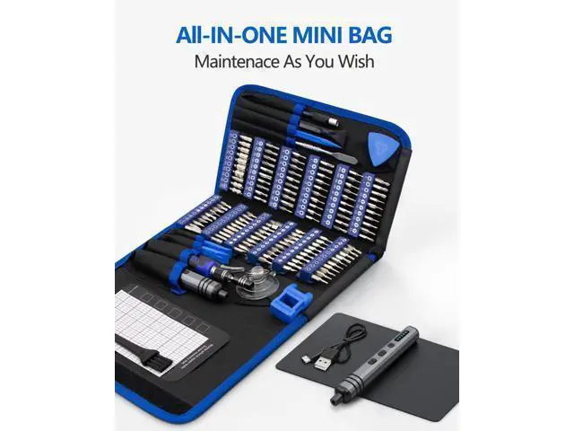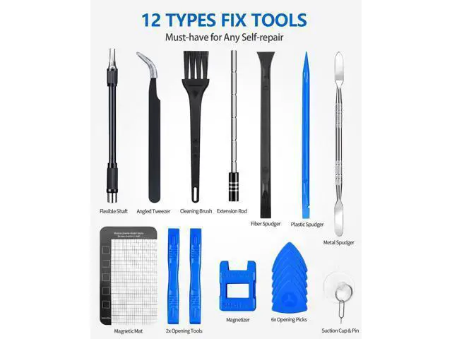 12 Types Fix Tools - The mini electric screwdriver set boasts an array of 12 types of electronic maintenance tools such as opening pick fiber spudger Jimmy flex extension angled tweezer suction cup magnetic mat etc. You don't need to run a repair business to benefit from this kit! If you're an electronics enthusiast home repairman PC manufacturer IT technician locksmith or just want to be prepared it will help you solve your problems.