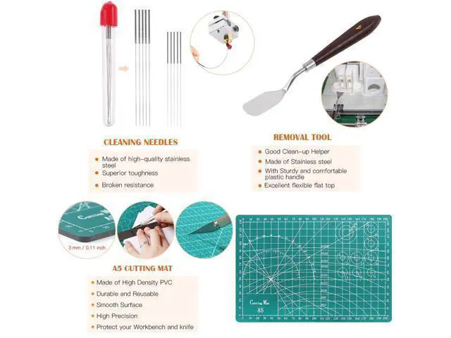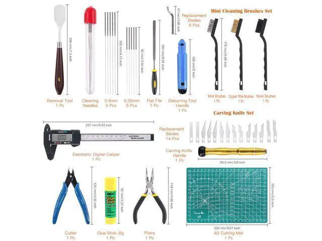 High-value KitPackage includes: 1pcs-Knife Clean Up Kit (13 blades with 1 handle), 1pcs- Removed Scarper, 1pcs-Flat File, 2pcs-Pliers, 1pcs-Electronic Digital Caliper, 1pcs-Cutting Mat, 1pcs-NB1100 Deburring Tool Handle, 6pcs-BS1010 Deburring Blades, 3pcs-Mini Cleaning Brushes, 1pcs-Glue Stick, 10pcs- Cleaning Needles, 1pcs- Zipper Bag, in total 42 piece. Great tool contains everything you need. Welcome to purchase!!! EXCELLENT PACKAGEThe whole set is packed into a handy zipper bag so that you could carry the toolkit to anywhere with ease. Moreover, it is convenient for you to store the complete kit preventing the small tool from losing. IDEAL GIFT FOR YOUR FRIENDIf your friends are interested in printing crafts, the 3D Printer Tool Kit is the perfect choice for you to choose a suitable gift. The toolkit contains various kinds of 42 piece essential tool with high quality. Or you could apply the toolkit to make an exquisite crafts for your friends. Your friends would be moved and appreciate you very much. Warm Note The new and old version of crafting knife set is randomly delivery. Pls don' t mind.