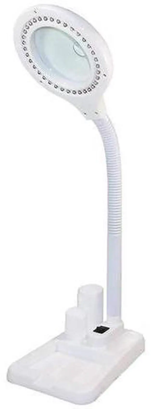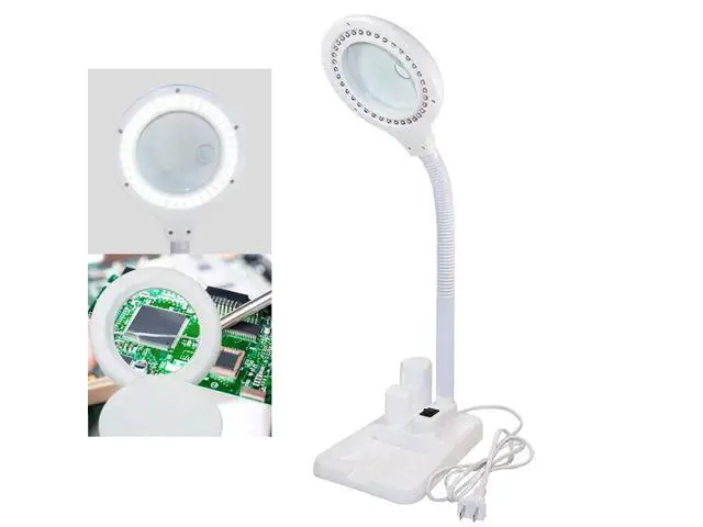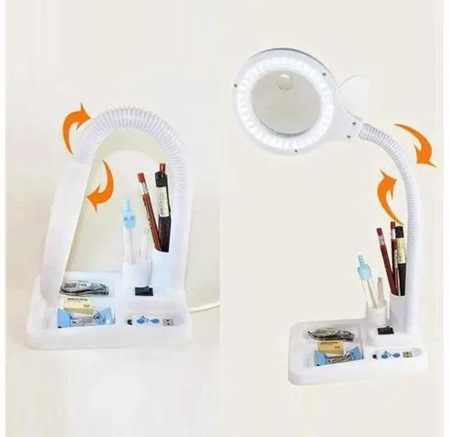 lenses: 10X. Different small objects can be magnified to different extents according to actual needs. Small lenses are more suitable in the case of chips, mobile phone repairs, etc. No need to buy 2 magnifying lamps. ADJUSTABLE ANGLE - 360 degrees rotatable head and adjustable neck, our desk lamp can reach just about almost every position you can imagine. Combination of magnifying glass and table lamp, easy to carry with you anywhere including office or bedroom. The magnifying lamp is light-weight and portable. SAVING ENERGY & MULTI-PURPOSE - Than traditional lighting, long lifespan, environmental friendly, low power consumption. It has 36 lights provide uniform and precise illumination under all conditions. Electronic energy - saving lamp, stable and reliable light, no flicker, no effect on vision. Great for Reading, Crafts, Repairing Electronics, Inspection, Soldering, Jewelry Design, Sewing, Antiques, Miniature Engraving etc. DUST COVER AND GROOVE DESIGN - 88 mm magnifying glass lens with hinged dust cover. Dust prevention, easy to clean. The base has a large and small bucket and 4 grooves.