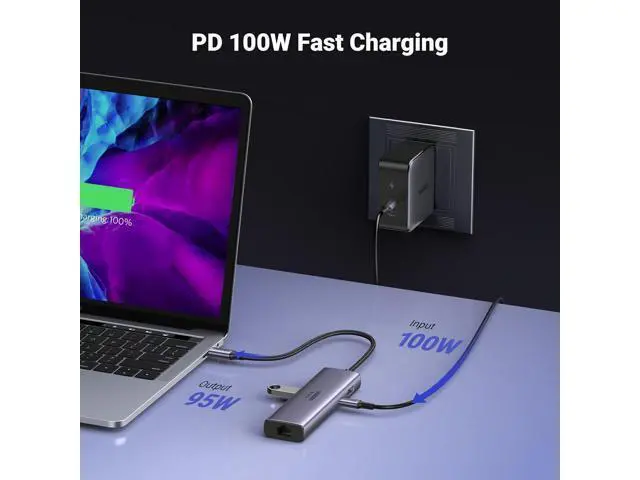 PD 100W Fast Charging: This USB C Docking Station is equipped with a 100W PD charging port. It only takes 1.5 Hours to fully charge Macbook Pro 15'', and without taking up another port of the laptop.