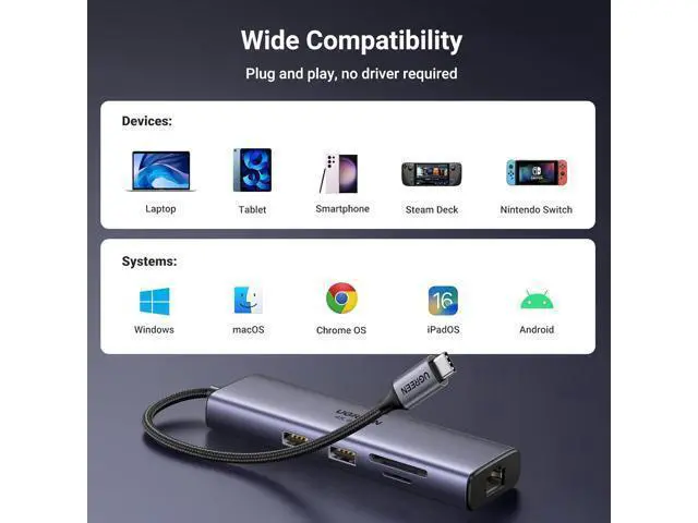 Widely Compatible & Driver-Free: The USB C Hub is compatible with most laptops, tablets, smartphones, Nintendo Switch, and Steam Deck. It's plug-and-play for Windows 11/10/8.1/8, mac OS, Chrome OS, Linux, iPad OS, and Android.