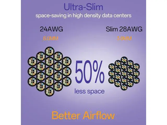 Ultra-Slim: Slim CAT6 patch cord is 50% thinner than standard networking cables. Slim Cat6 UTP patch cable is designed for space-saving in high density environments such as data centers telecommunication and server rooms.