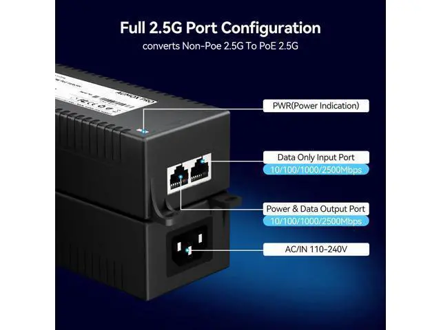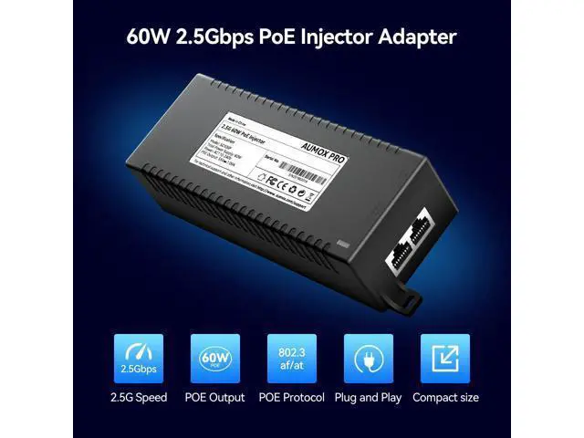 60Watts 2.5G PoE++ Injector: This 2.5 gigabit PoE injector complies with IEEE802.3af15.4WIEEE802.3at30wstandard, IEEE802.3bt PoE++(60W)