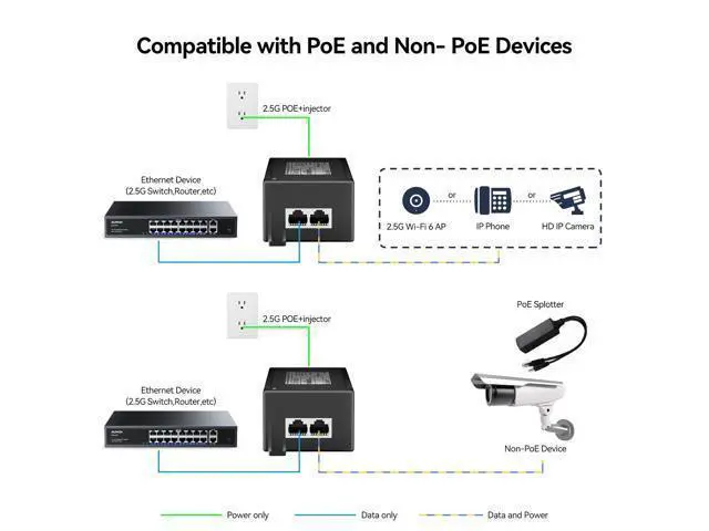 Supercharge Your Network:Deliver both high-speed 2.5Gbps data and 60W power (802.3af/at compliant) through a single Ethernet cable perfect for bandwidth-heavy devices like 4K IP cameras, access points, and smart security systems