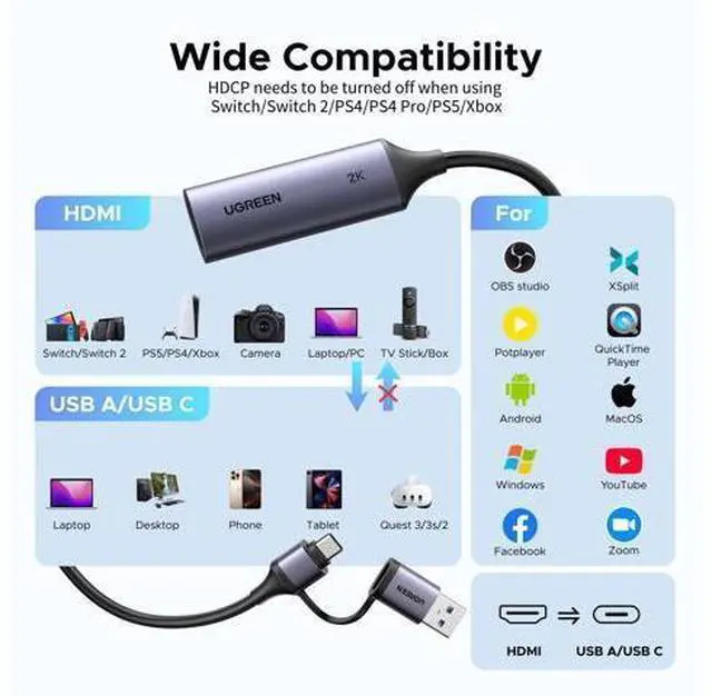 UGREEN 2K@30Hz Video Capture Card 4K Input HDMI to USB 3.0 A and USB C Capture, 1080P 60FPS with Low Latency Capture Card for Streaming Game Recording Compatible with Switch 2/Xbox/PS4/PS5/PC/Camera