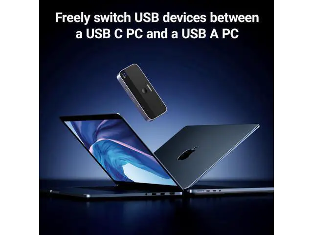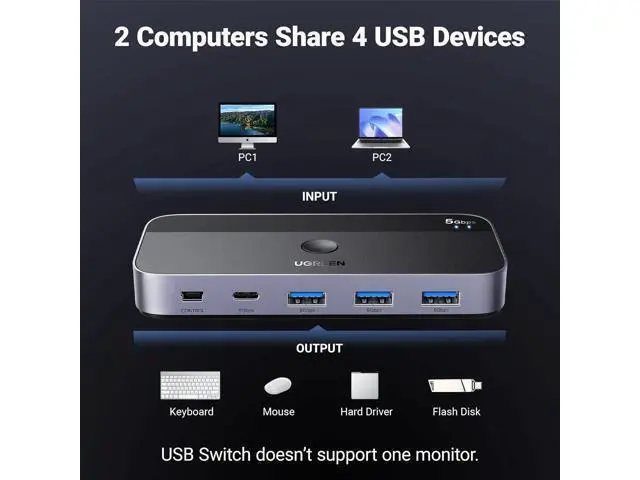 Output Tip: The USB port at the output is only used for data transfer and does not support power supply for a laptop/USB devices or video transmission. Not suggested to connect wireless devices to USB 3.0 switch due to 2.4G hz co-channel interference (industry problem). If your wireless network is affected, please set your router frequency from 2.4GH z to 5GHz.