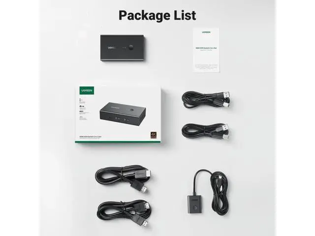 Get: 1×HDMI KVM Switch, 2×USB Cable 1.5 m 2×HDMI 2.0 Cable 1M 1×Desktop Controller Additional Features Widely Used & Driver-Free: With wide compatibility, this KVM switch HDMI 2 port box supports Windows 11/10/ 8.1 /8/7/Vista/XP, Mac OS, and Linux systems. Just plug and play and without any installation. This HDMI USB KVM switch is also compatible with most HDMI source devices, such as Nintendo Switch/Switch 2, PS5/4/3, Xbox One, TV Box, PC, Laptop, etc. It is widely applied for Enterprise, Office, Multimedia Teaching, Meeting Rooms, Gaming Rooms, Research Tests, etc