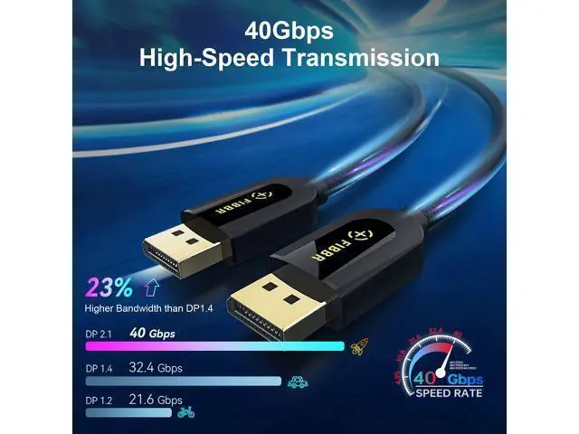 • 40Gbps Display Port Cable 2.1FIBBR display port to display port cable is VESA certified, and backward compatible with Display Port 2.0/1.4/1.3/1.2. Displayport 2.1 cable support transmission speeds of up to 40Gbps bandwidth for stable, high-speed transmission without signal loss.