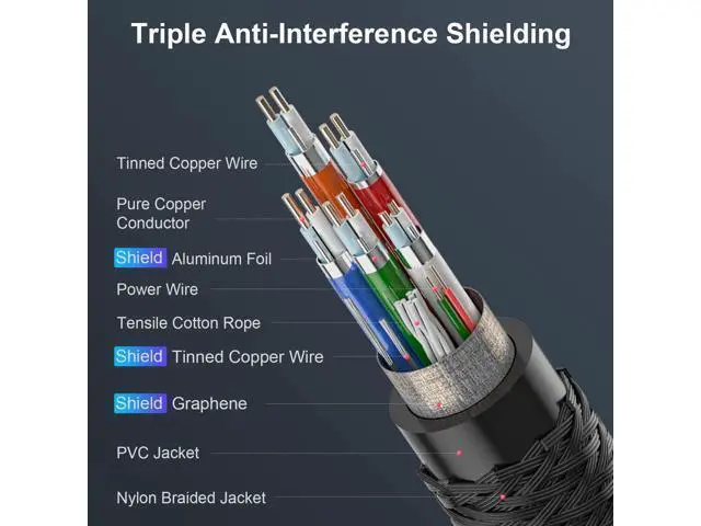 • Super Anti-Interference CapabilityDP to DP cable features a 28AWG pure copper core, triple shield and PVC braid jacket. The graphene shield provides superior EMI resistance. The dp 2.1 cable ensures stable signal transmission without worrying about artifacts and audio/video synchronization.