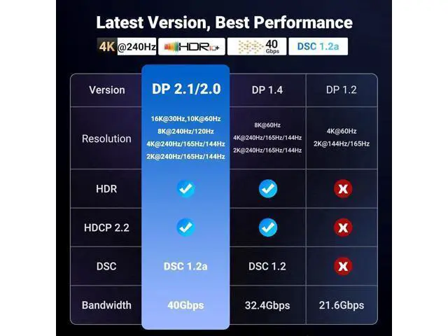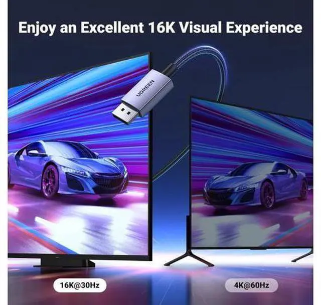 DisplayPort Cable: UGREEN16K DisplayPort cable 2.1 supports high resolutions 16K@30Hz, 8K@240Hz, 4K@240Hz 1080P@540Hz And backward compatible with Display Port 1.4 1.3, 1.2. Single-screen video output of 16K@30Hz (DSC 1.2 a), and dual-screen supported. The DP to DP cable also supports HDR, HDCP 2.2, FEC forward error correction and UHBR10 which ensure your immersive viewing experience.