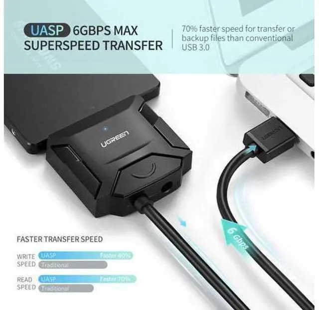 SAVE TIME WITH UASP: This sata to usb adapter supports UASP Technology, which is 70% Faster than traditional USB 3.0 and 80% reduction in required processor resources, which enables you to utilize the full potential of your SATA III SSD/HDD, when paired with a UASP-enabled host controller.