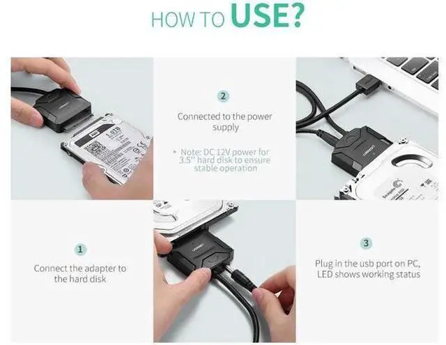 Plug&play Simple Operation: No need to install driver or install the SSD/HDD inside an enclosure, just plug and play. Hot-swap supported. Always eject the hard drive safely before unplug the adapter from your computer in case of data loss. 12V 2A