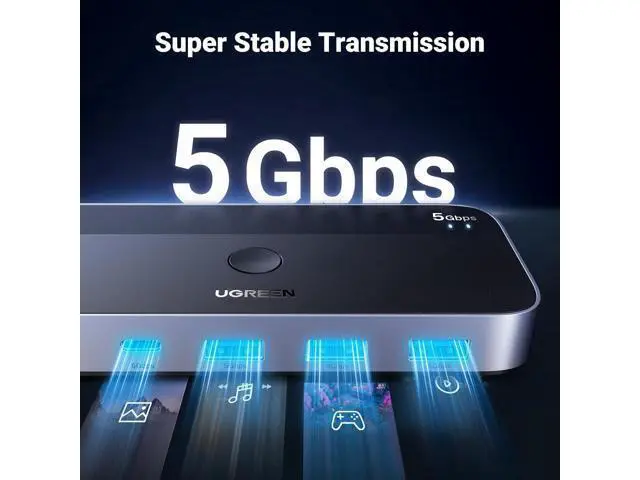USB A Devices: The USB 3.0 switch provides 1 USB C port and 3 USB A ports to support connecting various USB devices, extending more ports for two computers. (*It is recommended to power supply when using multiple devices simultaneously to avoid disconnection due to insufficient power. *) 5Gbps Data Transfer /
