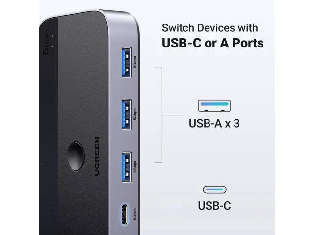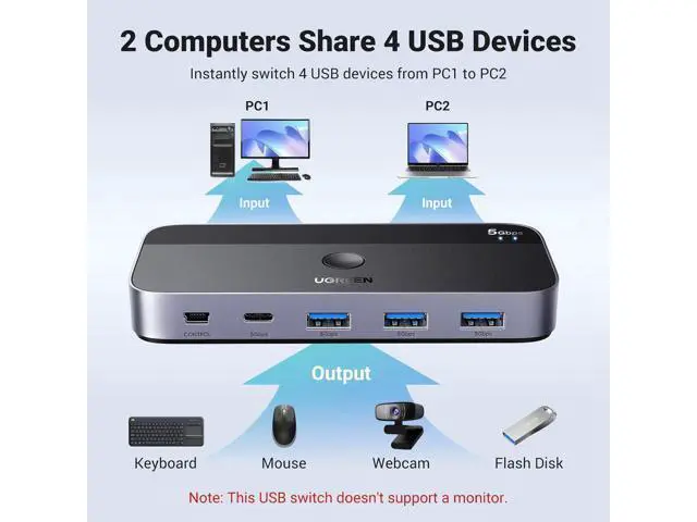PCs Share Multiple Devices: UGREEN 2-In 4-Out USB switcher supports 2 computers sharing 4 USB devices like keyboards, mouses, printers, headphones, and USB cameras. Switch freely between your work computer and personal computer and boost your work efficiency. (*Not a KVM switch and does not support a monitor or video transmission. *) Connect USB C &