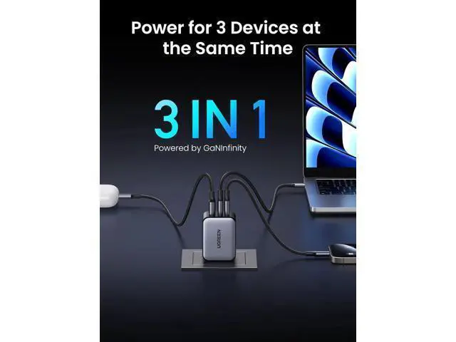 Port Fast Charging: With 2 USB-C ports and 1 USB A port, fast charging three of your devices at the same time, powered by GaNInfinity tech^^65W