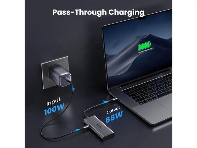 100W Power Delivery: The USB C Dock support for max 85W USB C pass-through charging over the USB-C PD port, so you can charge your MacBook Pro 13 from a low battery to 73% in an hour.