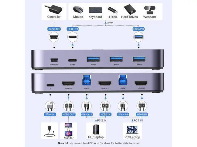 NOTE: Must connect Both USB A to B cables for power supply and data transfer. It only supports ONE monitor Sharing 4