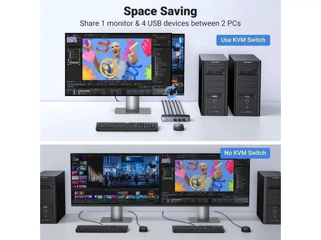 Resolution 4K@60Hz: This 2 port KVM switch HDMI supports resolution up to 4K@60Hz and backward compatible 4K@30Hz, 2560*1440@120Hz, 1920*1080@240Hz. UGREEN usb switch also support HDMI 2.0, HDCP 2.2 / 1.4, 3D, CEC, and HDR, which makes the image display more exquisite and realistic, color is more bright and moving.