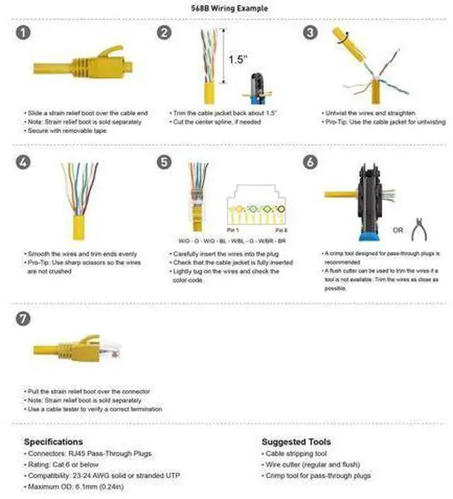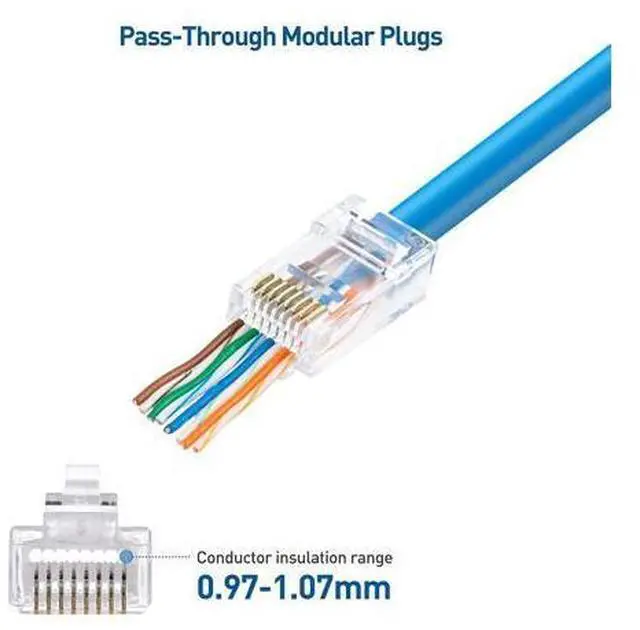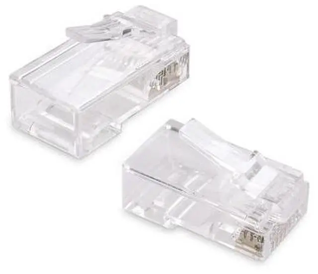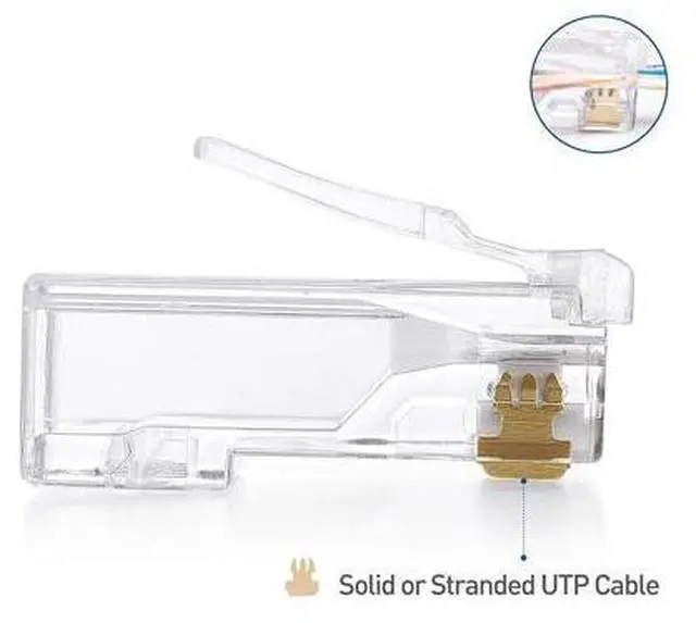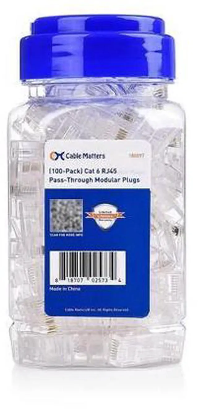 Cost effective 100-pack of Cat6 connectors provides enough connectors for a large project or multiple small jobs; Construct multiple patch cables in the perfect length for router, patch panel, or workstation applications with this crimp connector; Cat 6 crimp connectors are compatible with Cable Matters RJ45 Strain Relief Boots to protect the clip from accidental damage and bolster the integrity of the cable Convenient jar storage container protects and stores the Cat6 RJ45 modular connectors until your next project; Screw-on lid with an integrated handle makes it easy to carry the RJ45 ends along to the job site; A lifetime warranty is included with these RJ45 plugs for peace of mind when purchasing