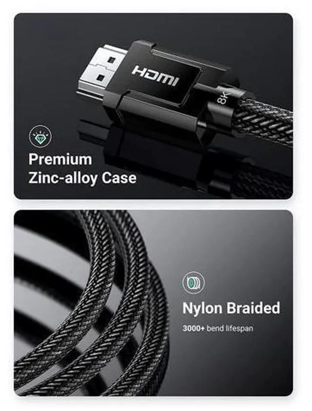 Durable HDMI 2.1 certified cable: UGREEN HDMI 2.1 cable is HDMI 2.1 certified, with a certification code attached to the package, which can be checked. This 8K HDMI cable is tougher than any other braid cable since it has armor nylon and all-metal port has longer service life and will never rupture.