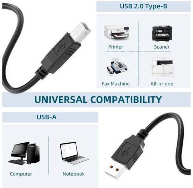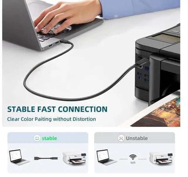 USB A to USB B Wired connection is more stable and faster than Wi-Fi connection. Ensure a more safe office space. Fully shielded provides superior transmission performance and protects against EMI/RFI noise. Flexible Connector Flexible PVC jacket and durable connector mold ensures for secure fits & easy cable handling. USB A to USB B Printer Cable High speed Data Transfer USB Printer cord supports USB 2.0 speed up to 480Mbps. Backward compatibility with USB 1.1 and USB 1.0. Stable signal connecting with printer.