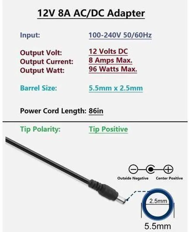 Power Input Port Size Confirmation: Please would check the DC power input port of your device. The port is 5.5 mm x 2.5 mm or 5.5 mm x 2.1 mm, and the inside polarity is "+", outside polarity is "-", you can choose this 12V 8A power supply. Otherwise, please choose other power supply according to above instructions.