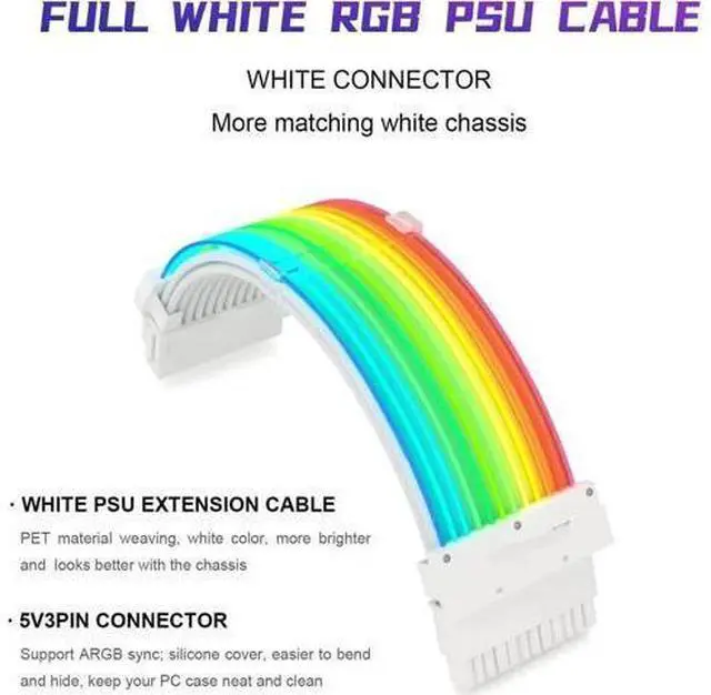 All-white DesignWhite extension cable, weave in white, suitable for white graphics card and motherboard, better customize your white chassis and keep the color consistent Update VersionDouble LED light sources increase the brightness of RGB, thus makes the RGB brighter, even under the day or the bright light environment, the brightness is still very bright, Stunning ARGB Lighting Effect. Let you have a more refreshing feeling in the process of gaming or work 24 Pin PSU Extension Cable Kit24Pin extension cable for motherboard adopt thicker copper core, suitable for high voltage, suitable for all power supplies on the market Addressable RGB SYNC ControlFit for Motherboard with 3-pin Addressable RGB header(+5V, DATA, N/A, GND), Package InstructionsRGB cable extension pc kit come with 1 X instruction manual, 1 X RGB motherboard cable, 1 X 3 PIN Universal Wire, 2 X 5V 3 PIN Connectors