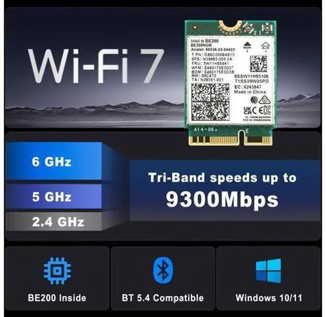 BE200NGW WiFi 7 CardThe 802.11BE Adapter provides tri-band (6GHz, 5GHz and 2.4GHz) signal. Based on technologies such as 4096-QAM, MU-MIMO, and 320MHz bandwidth, Maximum speed up to 8774Mbps(5800Mbps @6GHz + 2400Mbps @5GHz + 574Mbps @2.4GHz).