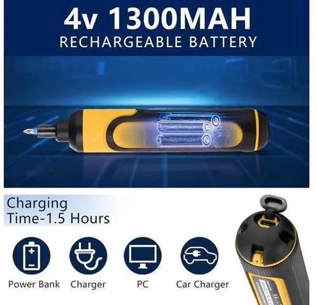 Humanised Design: This electric screwdriver is designed with dual LED light the LEDs will light up at the same time when it is started which will be very helpful in dark working environment and delicate work. If the screwdriver is not working for 10 seconds it will automatically enter the low-power mode and switch off the LEDs to effectively reduce power consumption4. Longer Battery Life Equipped with a built-in 1500mAhrechargeable lithium battery this tool offers long-lasting durability. With a universal Type-C interface it iscompatible with chargers for other electronic devices in yourhousehold allowing for convenient charging. lt only takes 1.5 hours toreach a full charge. When fully charged it will have up to 40 minutes of operating time5.
