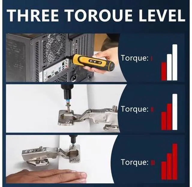 Precision Torque: Equipped with a 3 torque level of 1.5 /3/5 N. m and max hard torque of 5N. m. lmmediate stop the moment the finger lifts up work smartnot hard. This powerful electric screwdriver offers accurate torqueforces for your handy work needs
