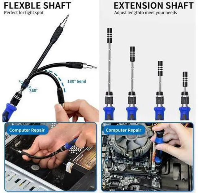 Deluxe Repair Tools Set: Contains 120 precision batch heads with 19 accessories, including extension pole, magnetizer, anti-static tweezers, pry bar. Whether you are a professional or a DIY enthusiast, you can easily deal with cell phone screen replacement, laptop dust removal, PCs assembly, rdrone paddle replacement, camera lens maintenance ^^