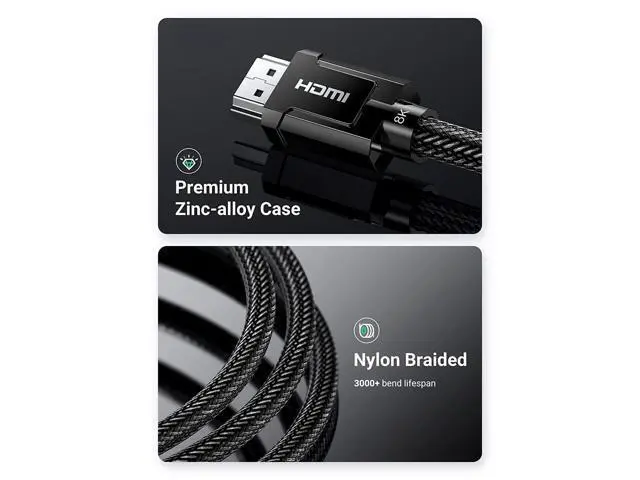 Durable HDMI 2.1 certified cable: UGREEN HDMI 2.1 cable is HDMI 2.1 certified, with a certification code attached to the package, which can be checked. This 8K HDMI cable is tougher than any other braid cable since it has armor nylon and all-metal port has longer service life and will never rupture.