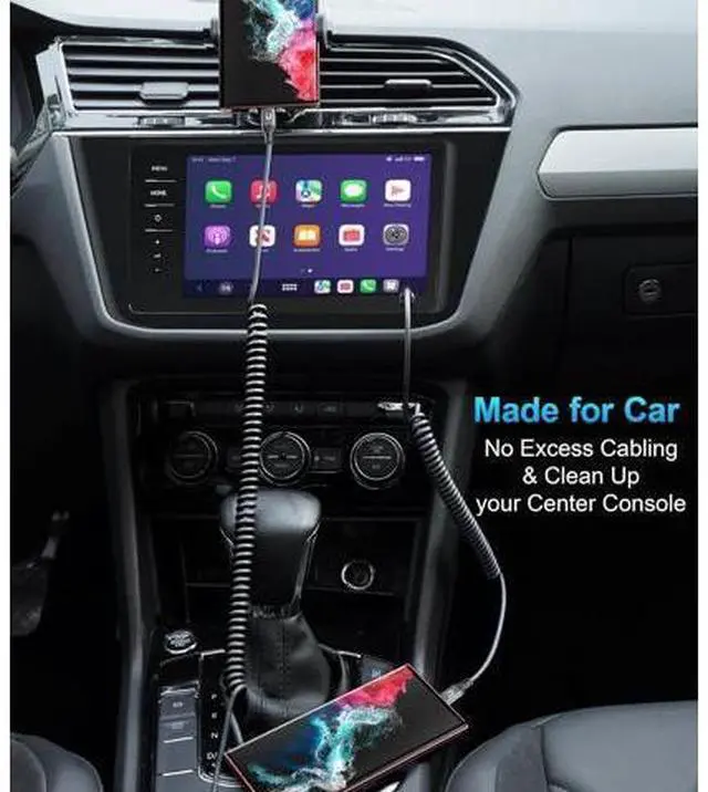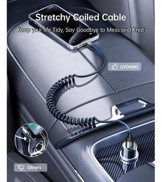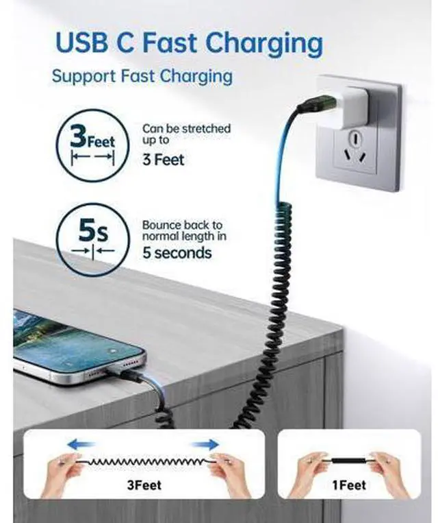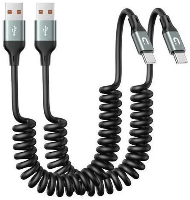 USB C Cable for Car This coiled USB A to USB C fast charging cable is portable and easy to use. It can save a lot of space in the car and bid farewell to the troubles of chaotic and tangled charging cables. ^^ iPhone 17/16/15 USB A to USB C Cables The coiled usbc charger cable natural length is 1.5 feet, stretchable to 4-5 feet (comfortable length), up to 6 feet. As a shorter expanded cord, its compact ability is more organized than a single straight cord. ^^ 66W USB C Cable Fast Charging and Data Sync E-Mark chip for safer charging.