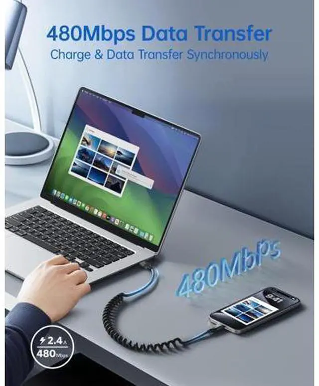 This USB-C Cable fast charges up to 60W, up to 3.0 A fast charging and up to 480 Mbps data transmission efficiency. ^^ Keep Your Car Clean and Tidy You will find it easier to keep your phone in spot in your car instead of all over the place. it is much neater and more convenient than a straight cable in your vehicle. The usb-c cables stretch out when you need them, but coil right up when not in use. The coil saves space and work well in a vehicle, a recliner, or in a home office.