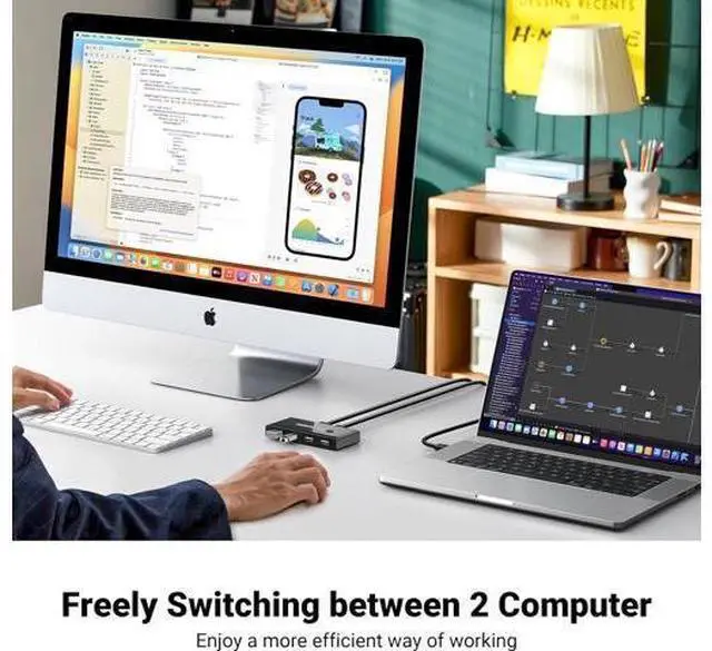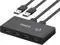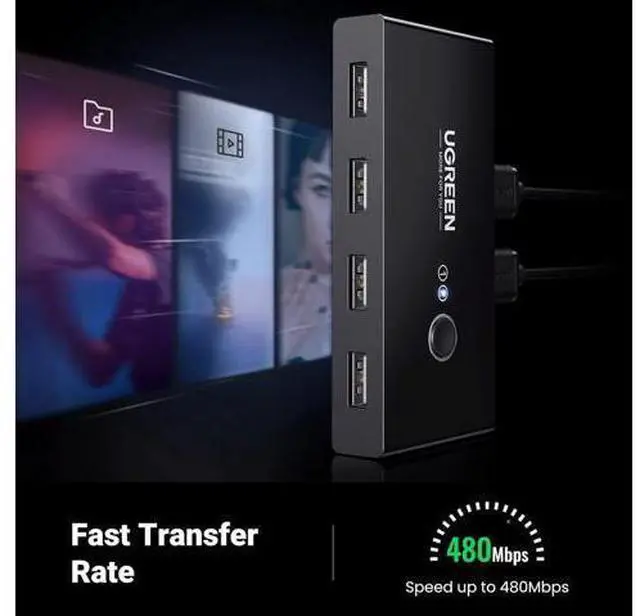 • 2 in 4 Out USB Switch Box: UGREEN 4 port USB sharing switch allows one button swapping between 2 computers to share 4 USB 2.0 peripheral devices without constantly swapping cables or setting up complicated network sharing software.