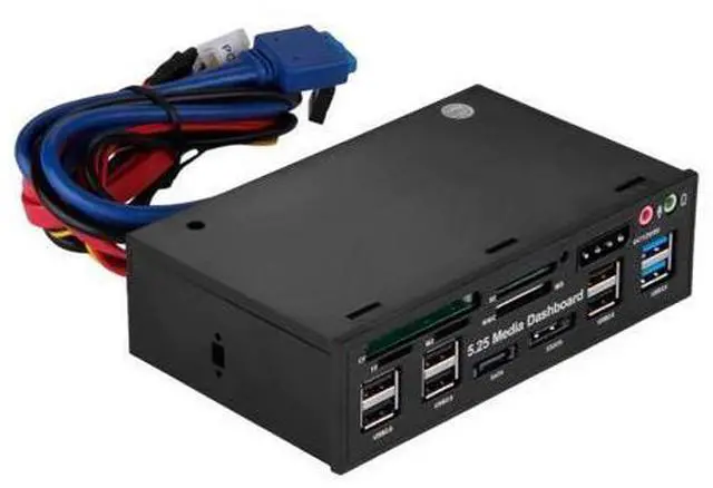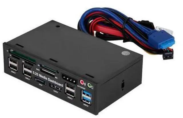 Package Contents: 1 x 5.25" e-SATA dual USB 3.0 Six USB 2.0 Five-in-one Card Reader Multi-Function Front Panel 1 x Media dashboard 1 x English User's Manual 1 pack of