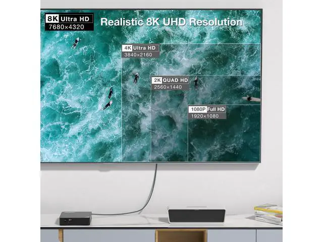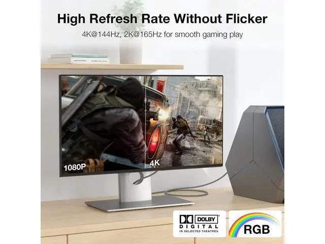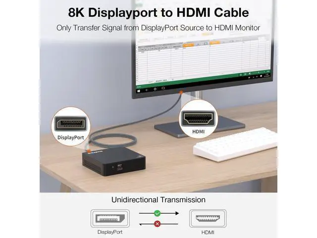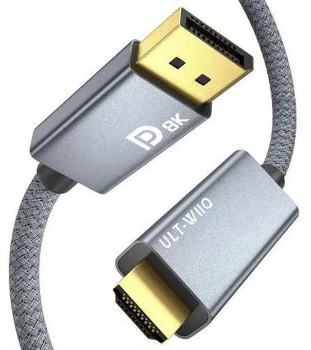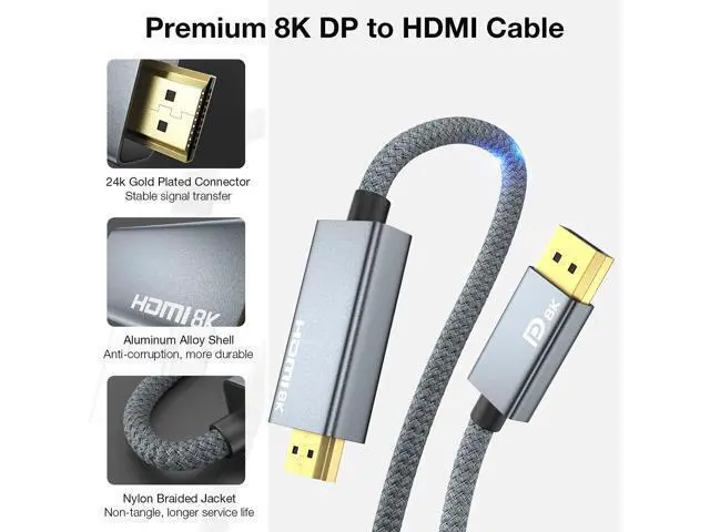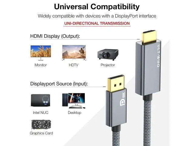 Note: It's a UNI-DIRECTIONAL cable and only converts from a DisplayPort source to an HDMI display. UltraHD 8K Blu-ray Video The uni-directional DP to HDMI Cable offers 8K resolutions up to 7680x4320, backward compatible with 4K@144Hz/120Hz, 2K@240Hz/165Hz/144Hz, 1080P@240Hz. Unlike other DP to HDMI cables that only support a 1080P refresh rate. And support for 32.4 Gbps bandwidth (HBR3), HDR, Dolby 7.1, HDCP 2.2, DSC 1.2 a display stream compression and 32 audio channels. Multiple Modes SupportedWork from home with ease. Stream the same media on a large display (Video mirroring) or take part in a Zoom meeting and view the report data simultaneously (Extended desktop) to improve work efficiency. Connect your laptop/Graphics to a second or even a third monitor with our cables, each still achieving up to 4K (3840*2160) high resolution. Reliable Performance Gold-plated connectors, slim aluminum shell, nylon braided jacket, combine together to provide both superior cable performance and reliable connectivity, and can withstands 20, 000+ push/pull test. Latch-free DP connector provide easily connecting and avoid damaging the original DP input port on your device. Universal Compatibility This DisplayPort to HDMI cord is compatible with laptop (HP ProBook EliteBook, Lenovo ThinkPad), desktop tower (HP, Dell, Lenovo), graphics card (AMD, NVIDIA) and other devices with a DisplayPort.