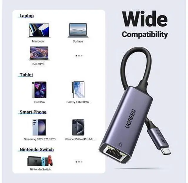 Widely Compatible: UGREEN USB-C to Ethernet Adapter is compatible with most laptops, tablets, smartphones, Nintendo Switch, and Steam Deck with USB-C or Thunderbolt 3 port, like iPhone 15/15 Plus/15 Pro/15 Pro Max, MacBook Pro, MacBook Air, Mac Mini 2023 (M2), Pixelbook, Chromebook, iPad, Galaxy Tab S8 tablet, and Galaxy S22/S23 Ultra/S22+/S22, etc.